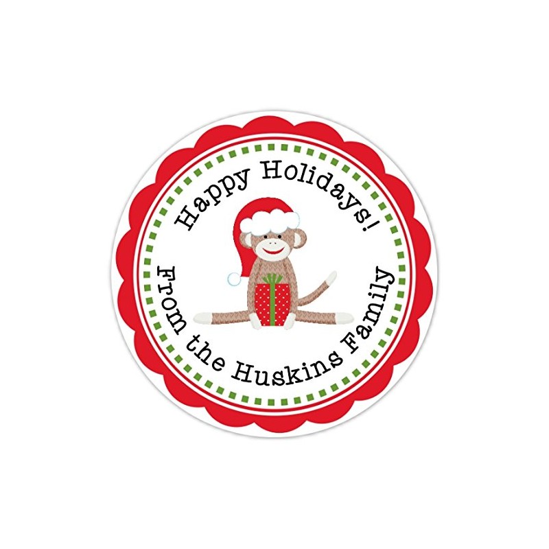 36 Christmas Address Labels, Christmas Sock Monkey Custom stickers, Holiday Stickers, 2.5 inch round