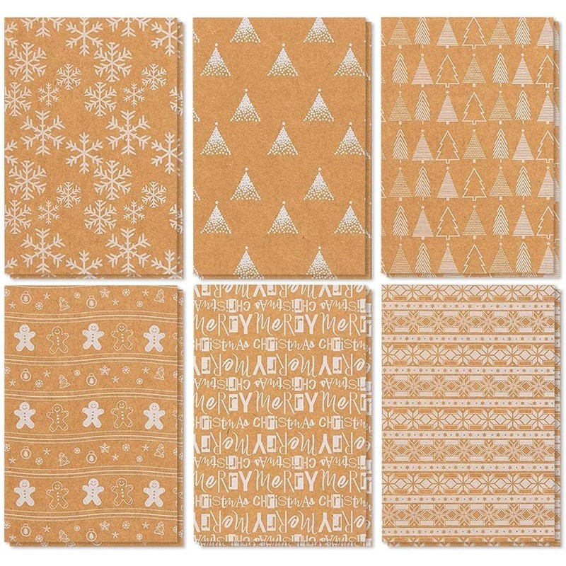 36-Pack Merry Christmas Greeting Cards Bulk Box Set - Winter Holiday Xmas Kraft Greeting Cards with White Print Designs, Envelopes Included, 4 x 6 Inches