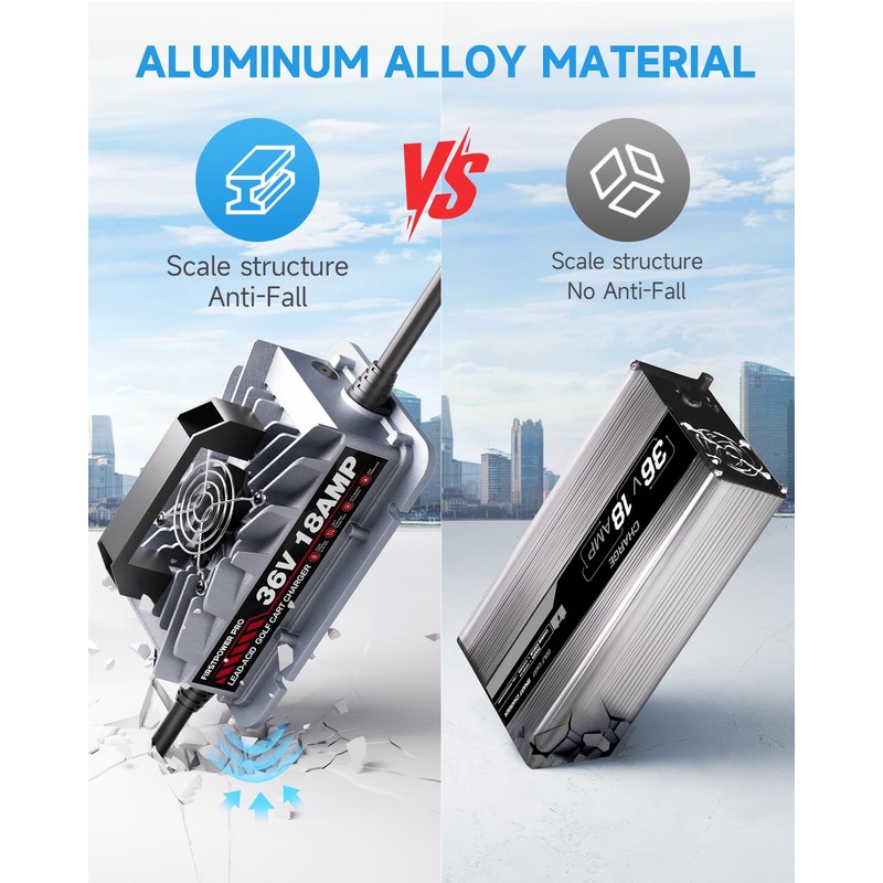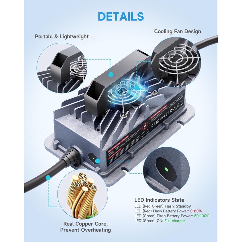 - Smart Protection Features: Offers multiple safety functions, including low-voltage and over-voltage protection, overheat and empty-load protection, short/reverse protection, and automatic shutdown when fully charged.