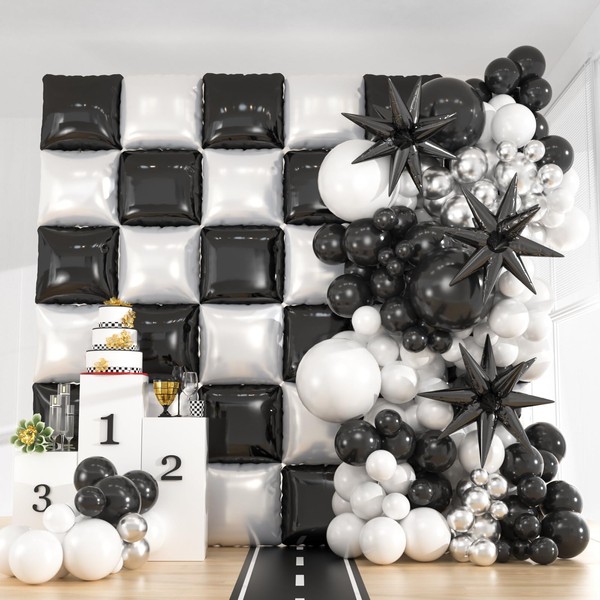 36pcs Black and White Double Sided Checkered Square Balloons Backdrop with 188pcs Black White Silver Balloons Arch Kit & 3pcs Star Mylar Ballons for Race Car Birthday Graduation Disco Party