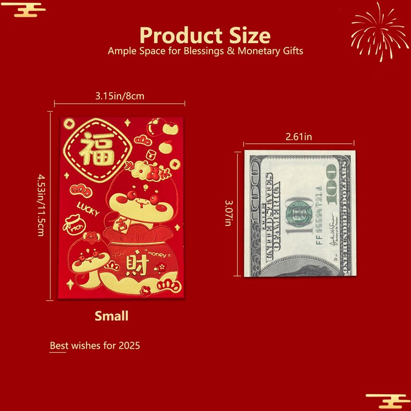 - Convenient Packaging & Ideal Size: Packaged neatly with 36 pieces in total, the set offers 6 unique patterns, each with 6 red envelopes, ensuring plenty of options for your gift-giving needs. Measuring 4.53x3.15 inches, these red envelopes Chinese New Year are perfectly sized to accommodate dollar bills and and good luck coins, making them both practical and presentable.