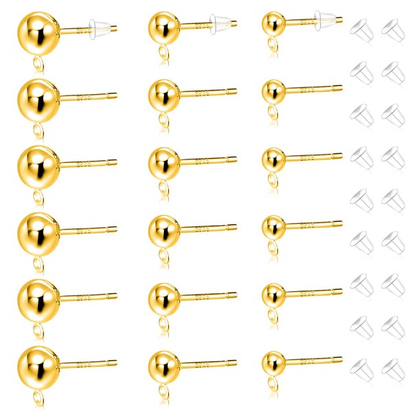 36Pcs Sterling Silver Earring Posts for Jewelry Making with Loop,3Size S925 Silver Round Ball Posts Earring Studs with Clear Ear Backs Hypoallergenic Ball Studs for Jewelry Findings Making Kit(K Gold)