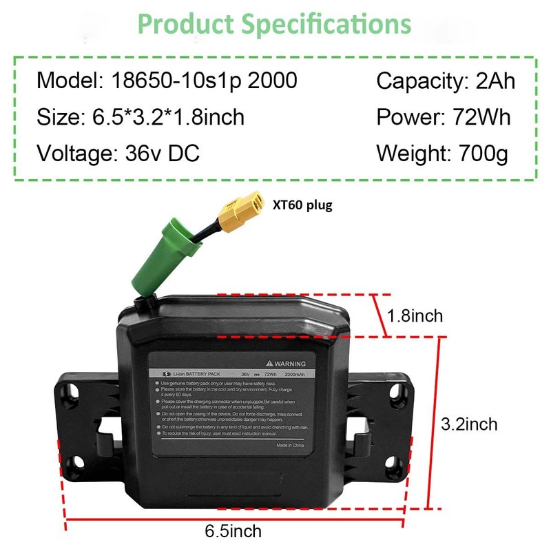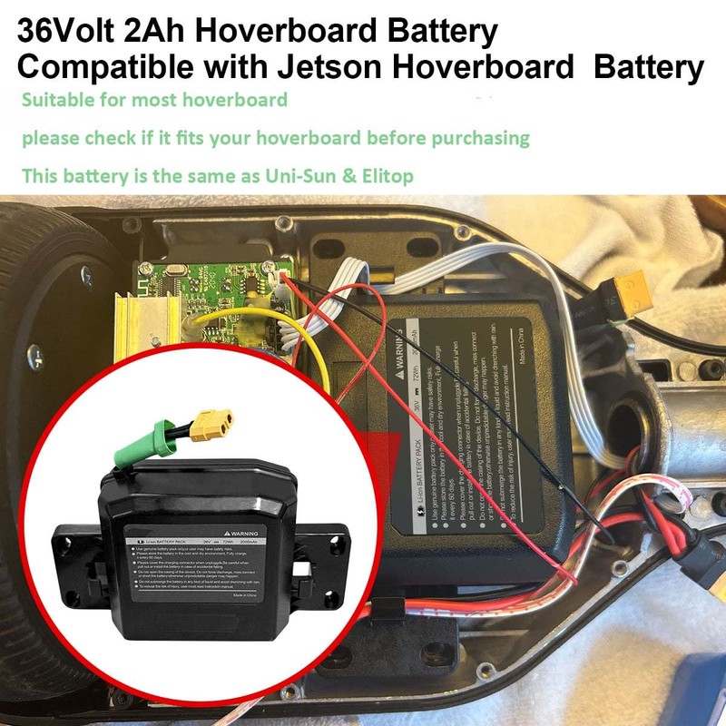- Precise Compatibility: Dimensions: 6.5 x 3.2 x 1.8 inches. Plug is XT60 female, Designed specifically for 36V 2Ah 72Wh hoverboards, Compatible with Jetson Hoverboard Battery, this replacement battery ensures perfect fit and seamless integration with your device. Check the battery size and voltage to ensure compatibility before purchase.