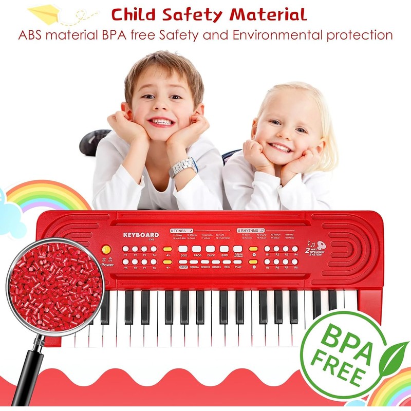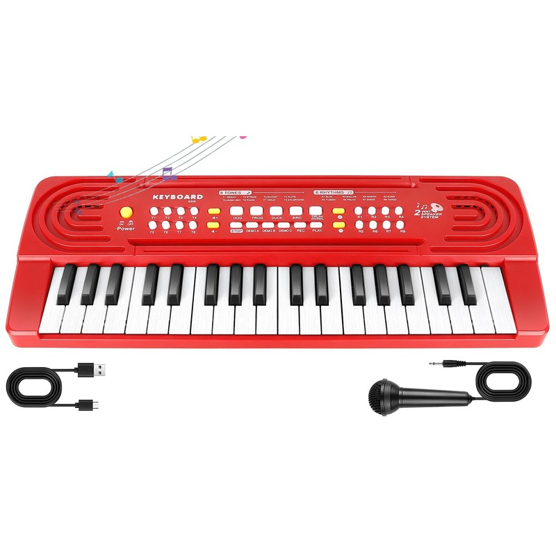 - 37 Key Piano Keyboard for Kids: This toy piano keyboard has built-in 8 rhythms, 8 tones, 19 demos, 4 percussion/4 animal sounds, volume/tempo control, and the updated dual speaker design will produce high-quality sounds and effects.