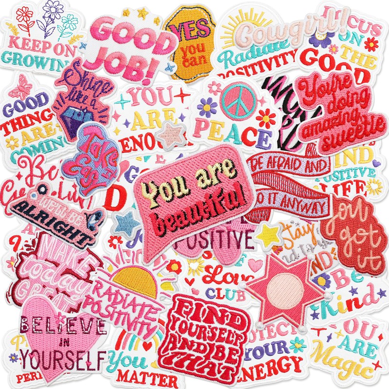 38 Pcs Positive Affirmations Iron On Patches Bulk, Cute Hat Patches for Women/Girls, Embroidery Heat Press Patch with Inspirational Words for Clothes/Backpacks/Jackets DIY Decoration