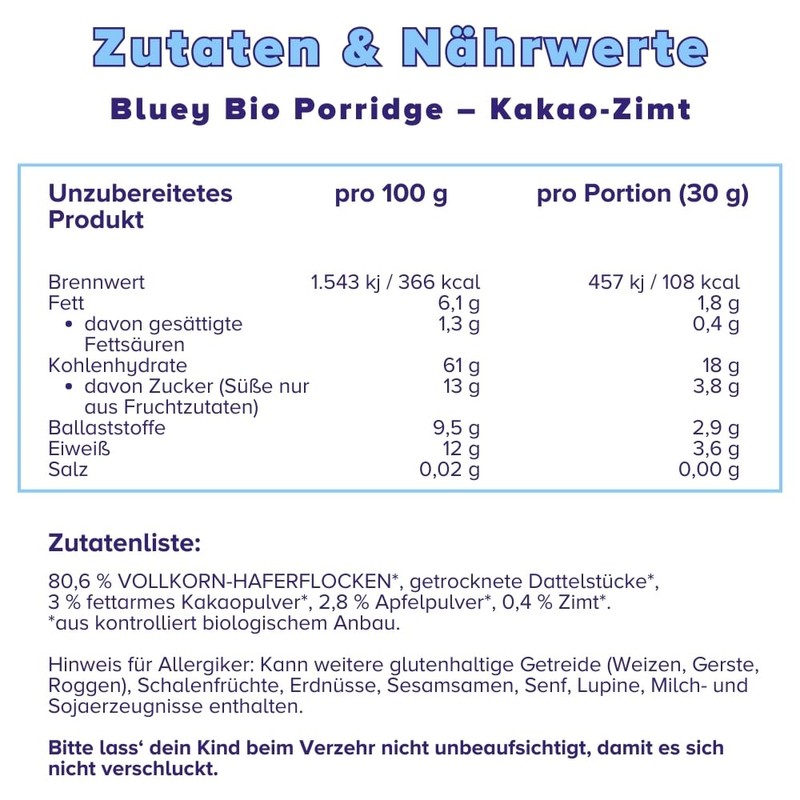 Start your day with the delicious Bluey Organic Porridge from 3Bears! The combination of fine cocoa and cinnamon ensures an irresistible breakfast experience - without refined sugar and 100% vegan.