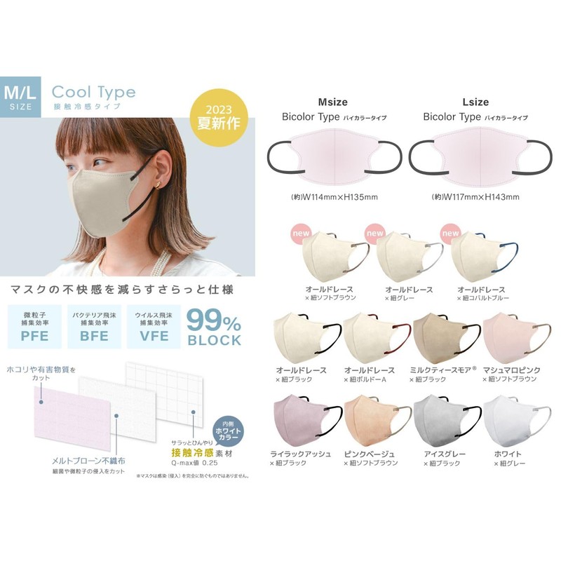 - 特徴:接触冷感マスク/選べるカラー/3D立体デザイン/99%カット高密度フィルター/平ゴム採用/3層構造/シェアしやすい小分け包装/小顔効果/風邪予防/飛沫対策/花粉対策/PM2.5対策/ウイルス飛沫対策/ハウスダスト対策