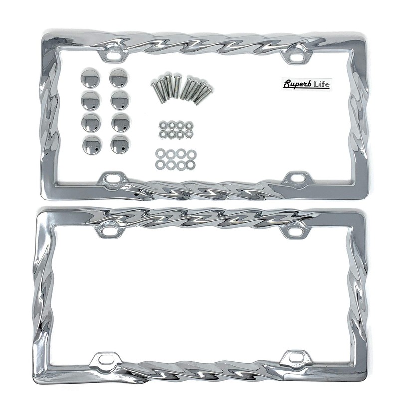 3D Curly Wave Pattern License Plate Frame Chrome Twist with Screws Caps, Set of 2