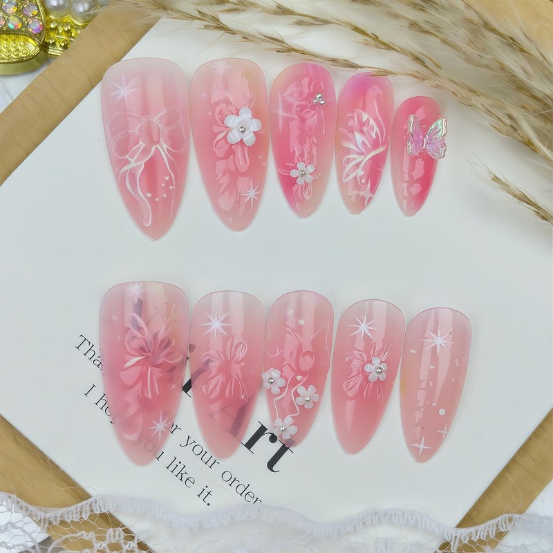 3D Flower Summer Press on Nails Medium Almond Fake Nails with Flowers Butterfly Designs Stick on Nail Bow False Nails Rhinestones Full Cover Acrylic Reusable Cute Nail Suitable Women Daily Wear