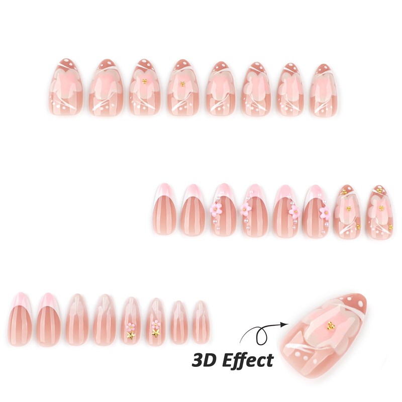 3D Handmade Press on Nails French Tip Medium Almond Shape False Nails Flower Fake Nails with Charms Reusable Acrylic Nails Summer Almond Medium Nails Glue on Nails Star Pearl Stick on Nails for Women