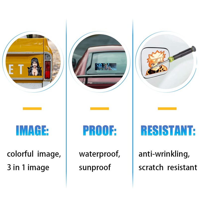 - 【PET Material】Upgrade PET anime car stickers, they are great stickiness, waterproof, sunproof, anti-wrinkling, scratch resistant(exclusive protective layer), and can keep its bright pattern for a long time.