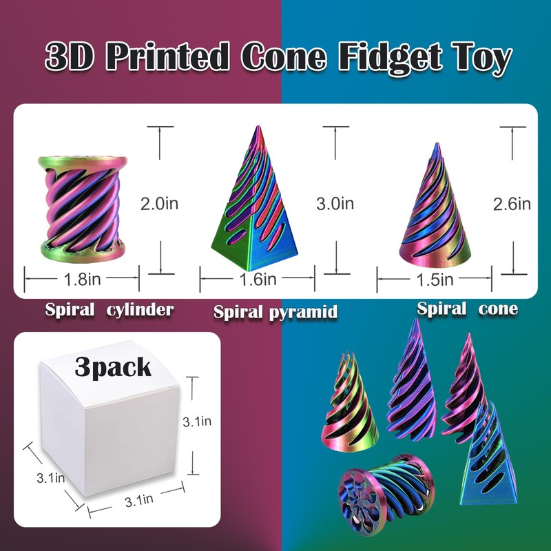 - :Lightweight and portable: The 3 pcs 3D printed fidget toys set provides three different styles, the spiral fidget pyramid toy size is 1.96*1.96*3.94 inches, the impossible cone fidget size is 1.77*1.77*3.14 inches, the spiral cylinder fidget toy size is 1.96*1.96 *2.16 inches, compact and convenient, easy to carry around and play with these 3 8D printed small fidget toys set.When you play with these anxiety relief toys, you will feel quite relaxed.