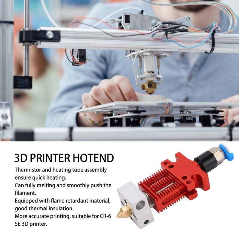 1、Fast in Heating: The thermistor and heating tube assembly can quickly heat and sense the nozzle temperature up to 260℃. 2、Better Printing: Fast heating can fully melting the filament, which enables stable feeding and high printing accuracy. 3、Premium Designs: Comes with flame retardant material for heat insulation, and the cleaning is more convenient as well. 4、Perfect Fitting: Suits perfectly for CR-6 SE 3D printer, the hotend with integrated and sturdy structure is very stable. 5、Great Materials: Adopting premium aluminium alloy material, the extruder hot end also has a silicone protective cover.