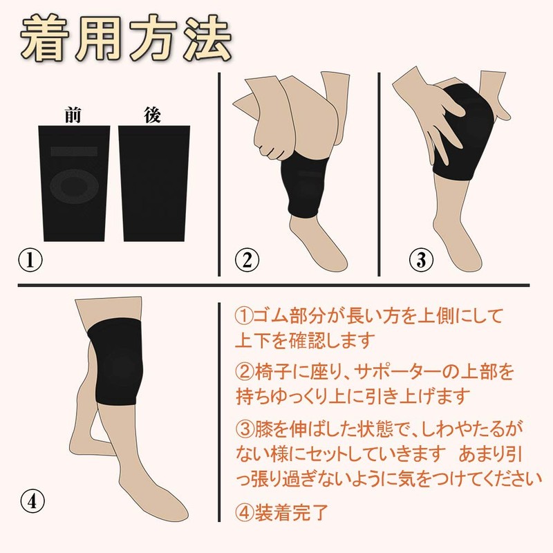 - 【セット内容】●膝サポーター二枚 ●説明書 注意:●人々の使用感は個人差があります。サイズ表を参考して、自分の太ももにぴったりしたサイズを選んでみて下さい。●シリコン(滑り止め部分)にアレルギー体質の方で皮膚がかぶれやすい場合がありますので、本品が触れる部分に、傷、かゆみ、かぶれ、湿疹等がある場合はご使用しないでください。アレルギー体質の方で皮膚がかぶれやすい方はご使用を避けてください。