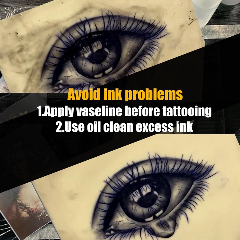 - 💛AVOIDING INK PROBLEMS - Cover fake skin in Vaseline before tattooing. Dab with the paper towel instead of wipe to clean ink. At the end if there’s still ink, spray cooking oil over the fake skin and rub it in then clean off with soap