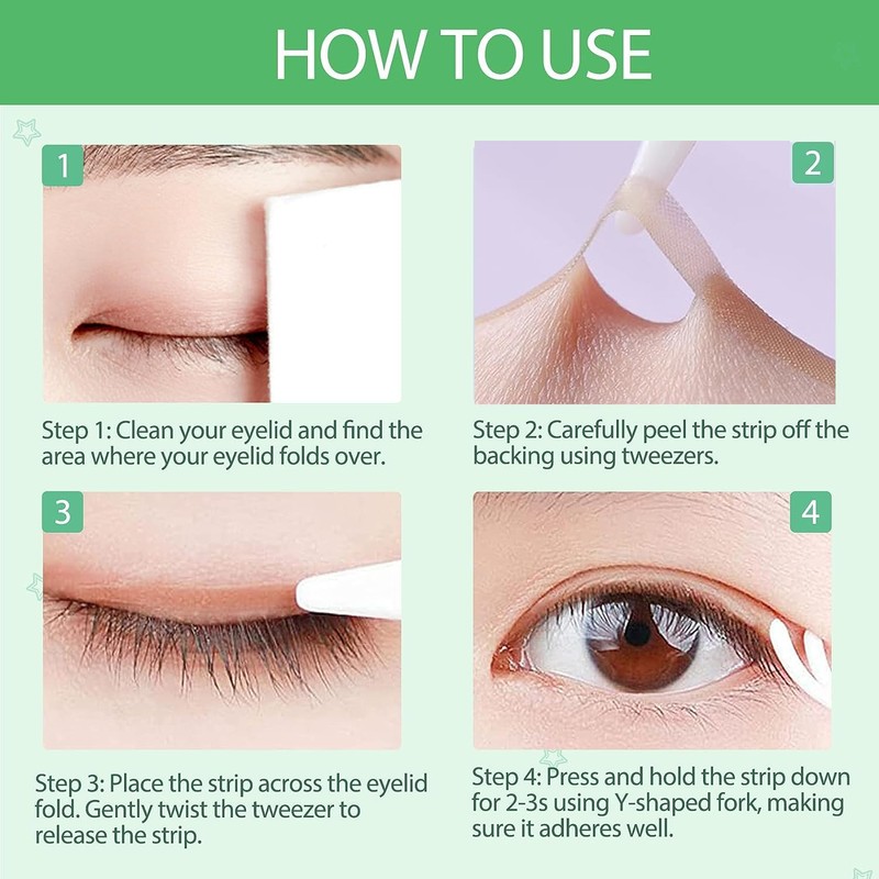 - Easy Application - Just three steps 1. make sure your eyes are clean&dry before use,2.Identify the area where your eyelid is folding over, 3.place the strip on the eyelid fold(eyelid crease) and using your fingers to ensure a complete bond to the skin.