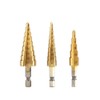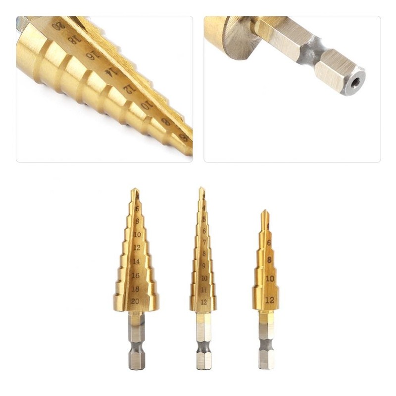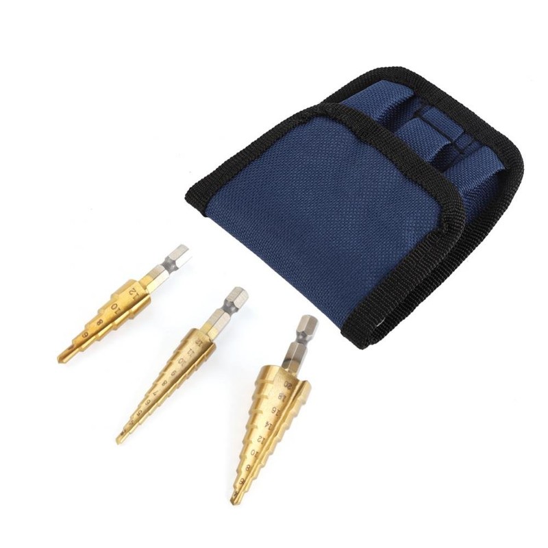 3Pcs Juego de Brocas Escalonadas High Speed Steel HSS Hex Shank Plating Drill 3-12mm, 4-12mm, 4-20mm con Bolsa de Almacenamiento