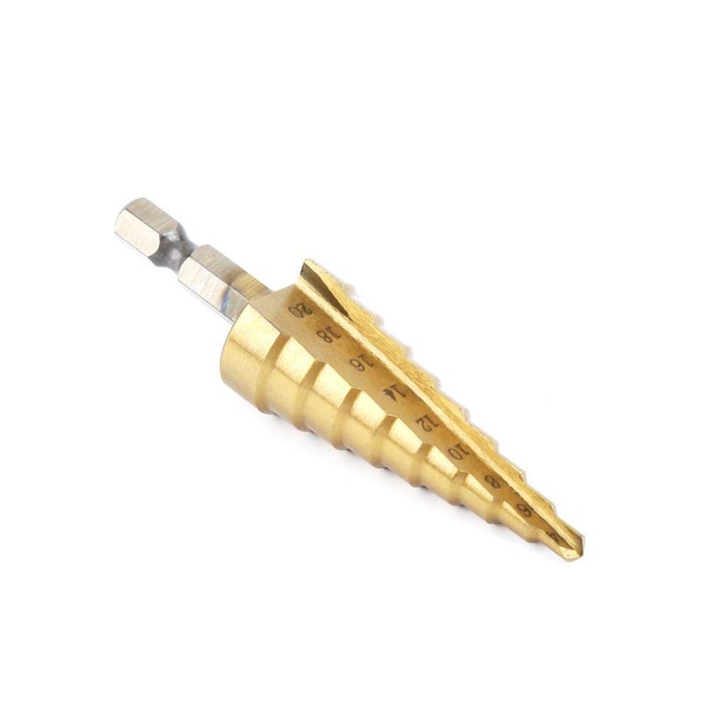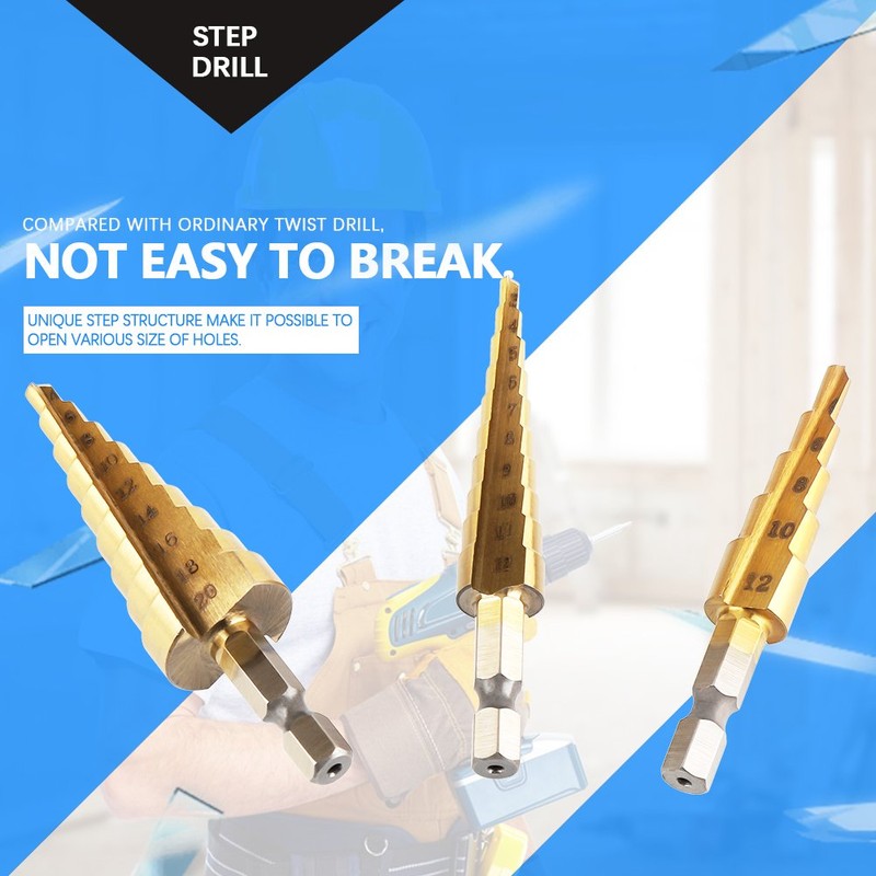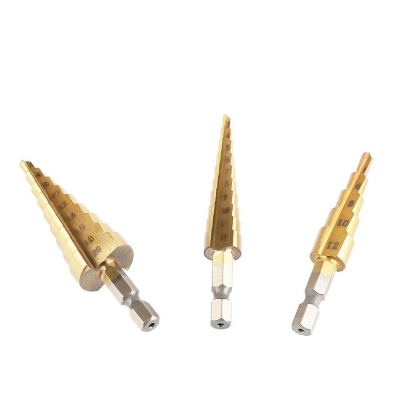 HSS Step Cone Plating Bit Drill Bit, está hecho de acero HSS de alta calidad con recubrimiento de titanio para reducir la fricción y el calor, que se utiliza para cortar planchas de hierro, materiales de aluminio, planchas de aislamiento y planchas de PVC.