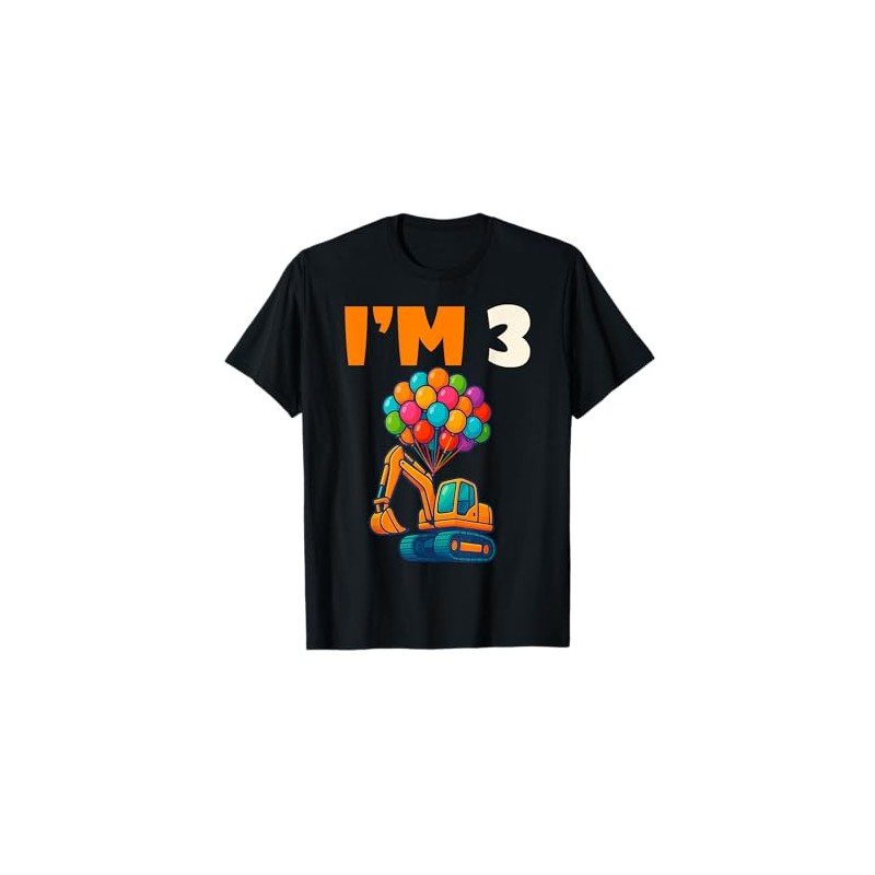 • Bold “ I’m 3 ” shirt with cartoon excavator flying by balloons; perfect for boys who love construction trucks, digging, and fun birthday adventures. Family, Cute, Cool, Up Year Old Age. Milestone Car, Vehicle Shirt. young builders, fans of heavy machinery