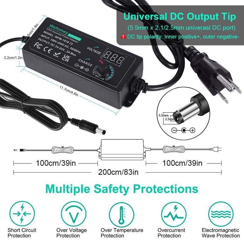 - 【Worry-Free Shopping】Package includes 1 x 3~24V 72W universal ac/dc adapter, 14 x DC tips, 1 x reverse polarity converter, 1x alligator clip test lead, 1x male DC power pigtail cable. We focus on producing premium quality and safety power adapters. If there is any issue, please feel free to contact us. We have 30 days money back guarantee, 24 months exchange.