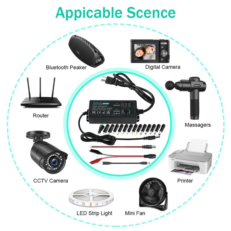 - 【72W DC Power Supply】The 72W all-in-one multipurpose AC/DC adapter fit for many 3~24V small household electronics such as LED strips, 3D printer, TV Box, smart speaks, wireless routers, essential oil diffuser humidifier, USB fan, Wifi camera, USB Hub, hard disk box, DC motor, DC pump, digital photo frame, DVR NVR surveillance system etc.For indoor use only. (Check dc jack before buy: 5.5x2.5mm, compatible 5.5x2.1mm)