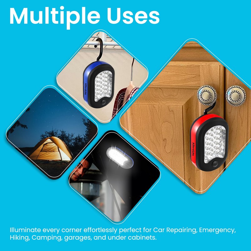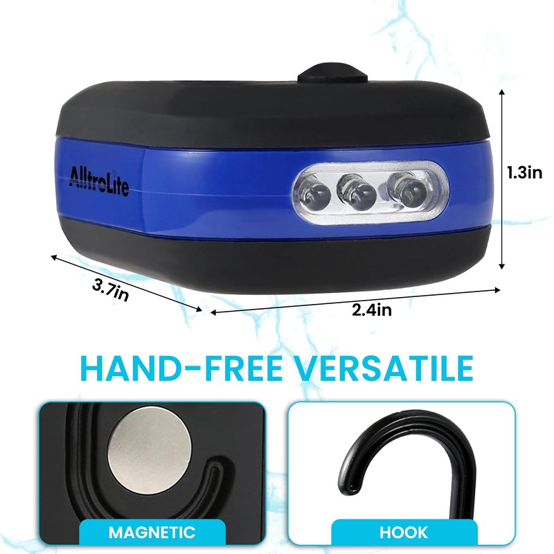 AlltroLite 3-Pack LED Work Light | Portable Magnetic Work Light with Rotatable Hook, Magnetic Back & Push Button | Battery Operated Pocket Work Lights for Car Repairing, Emergency, Hiking, Camping