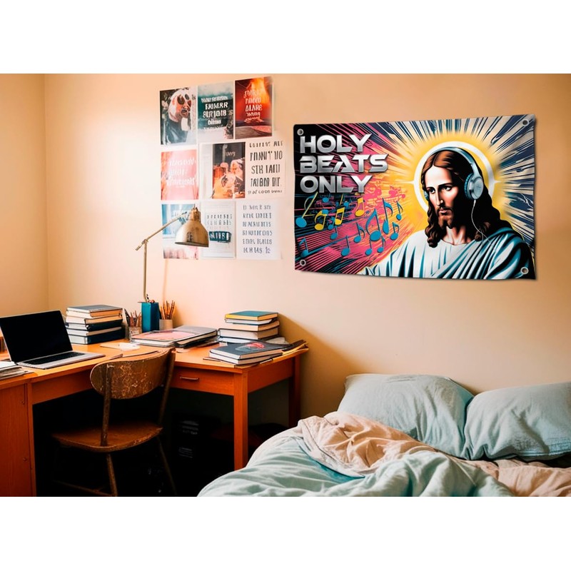 - Posters 3x5 ft for college dorm wall decor, dorm room decor for guys and girl, funny tapestries Jesus in headphones banner for room or flags Jesus tapestry, cute room decor christian flags for dorms.