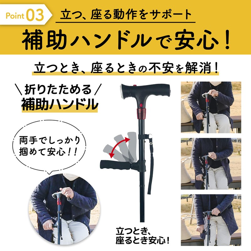 - ✅【補助ハンドル付き】折りたたみ可能な補助ハンドルで、立つ、座るなどの『膝に負担のかかる動作』も快適にサポートいたします。他の人の手を借りず、ご自身で立つ、座るなどの屈伸運動ができれば、お出かけもさらに楽しくなること間違いなし!女性用にも男性用にもお使い頂ける、敬老の日や長寿のお祝いのプレゼントにも喜ばれる介護用の多機能杖です。