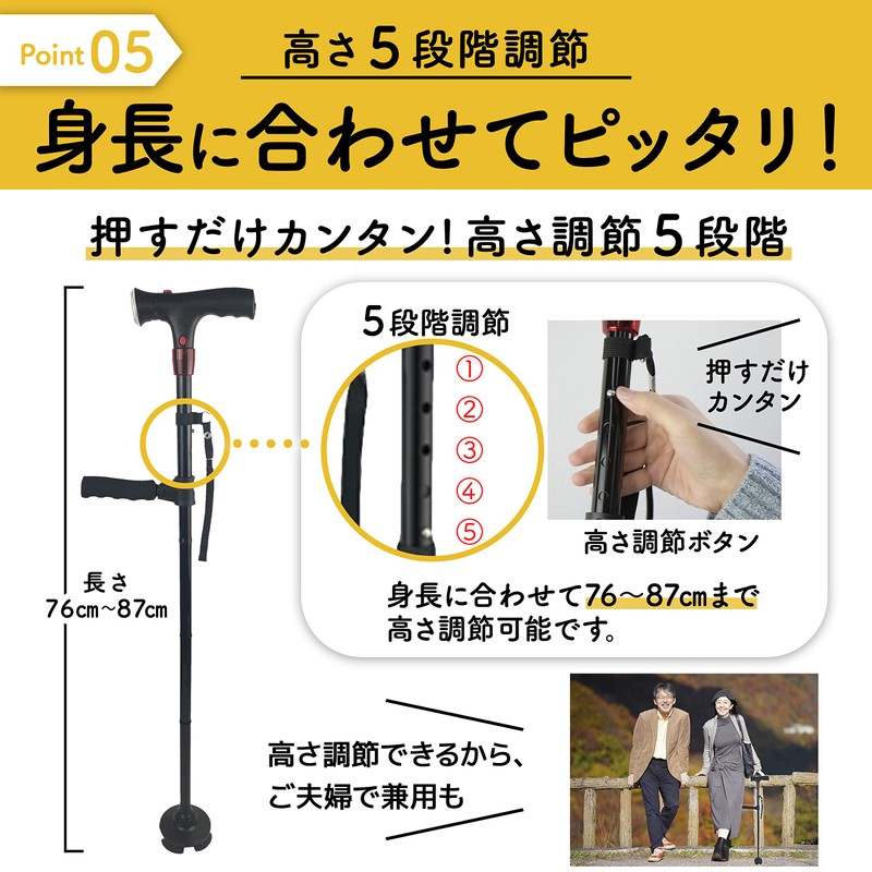 - 【高さ】76〜87cm(5段階に高さ調整が可能)身長約148cm~170cmの方まで幅広く使用できるので女性用としても男性用としてもお使いいただける折りたたみ杖です。ご夫婦で使用されてはいかがでしょう。 【重さ】480g【耐荷重】115kg【素材】アルミ