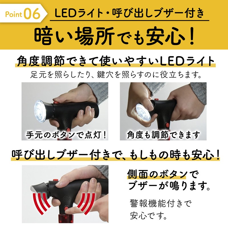 - ✅【LEDライト・警報機能付き】安心・安全にお使いいただくための『LEDライト』と『警報機能』付き。早朝や夕方、夜間にお出かけの際に便利なLEDライトは、角度の調節も可能です。また、万が一の時のための警報機能付き。便利な介護用の多機能杖が、安心で安全なお出かけをサポートします。