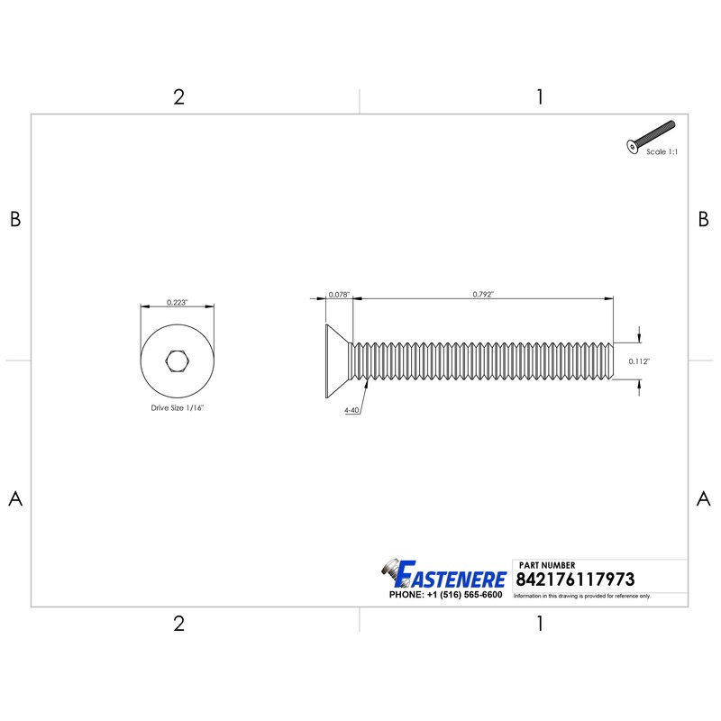 The stainless steel socket cap screw has a plain finish and a flat head with an internal hex drive. Stainless steel resists corrosion and may be magnetic. The flat head is cone shaped for use in countersunk holes and has a flat top that fits flush with the mated surface. The internal hex drive, also known as a hex-socket drive, has a hexagonal slot that requires an Allen key driver, also known as a hex key or Allen wrench. Socket cap screws are threaded fasteners that have a cap head with an internal socket drive for installing in areas with limited side clearance. These screws are available with a variety of head shapes, which determine how the screw interacts with the mating surface, and drive styles, which determine the type of tool required to install the screw.General Product Information: