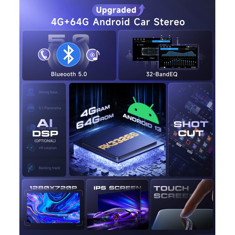 - 【DSP 32EQ & 5.0 Bluetooth】 Built-in DSP technology enhances car audio with rich, lifelike sound and customizable settings, plus a 32-band EQ for personalized audio. Featuring Bluetooth 5.0 and an upgraded chip, it offers faster pairing, stable connectivity, and precise positioning—ideal for hands-free calls and music streaming