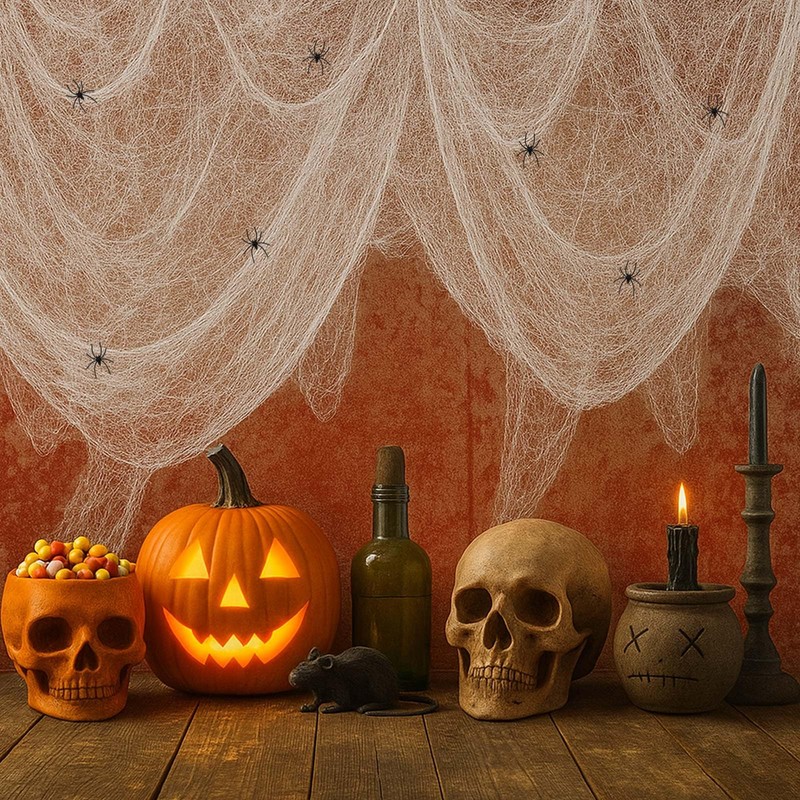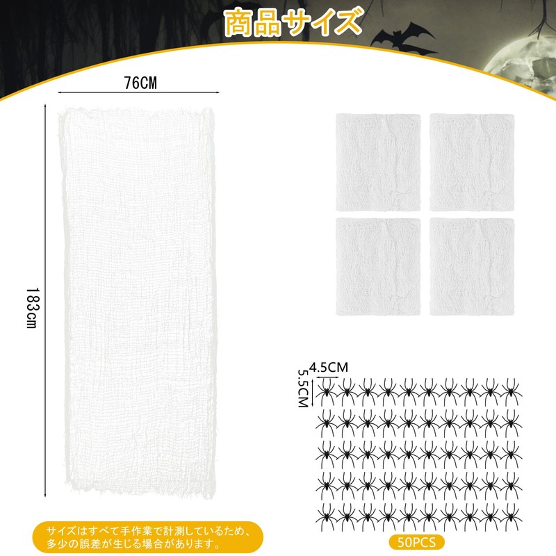 - 【商品仕様】セット内容:蜘蛛の巣*4枚、シミュレーテッドスパイダー*50個。素材:ポリエステル・コットン混紡。サイズ:約76cm×182cm/枚。重量:約45g/枚。ご注意:折りたたんで梱包されているため、商品到着時に若干のシワがある場合がございます。洗濯や低温アイロンで改善できます。