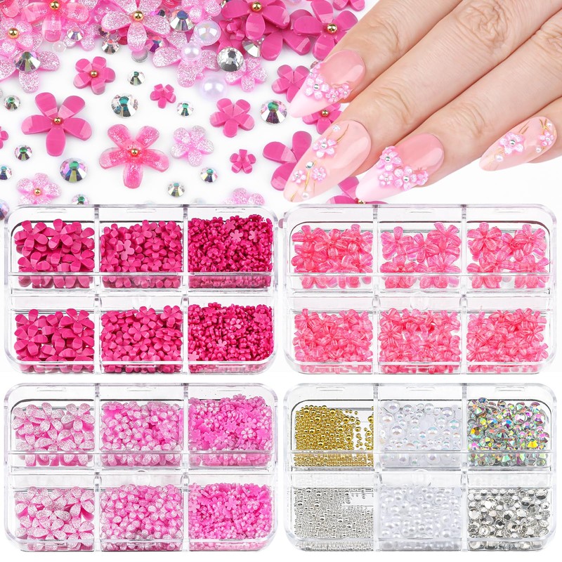 - Flower Nail Charms Kit: You will receive 4 boxes of nail art flower set, it contains 1 box solid rose flower charms, 1 box glitter rose flower charms, 1 box clear rose flower charms, 1 box clear/AB rhinestones & gold/silver small nail beads & AB/white pearls. There are enough styles and quantities to meet your daily nail art needs, making it easy for you to start a pleasant nail salon at home.