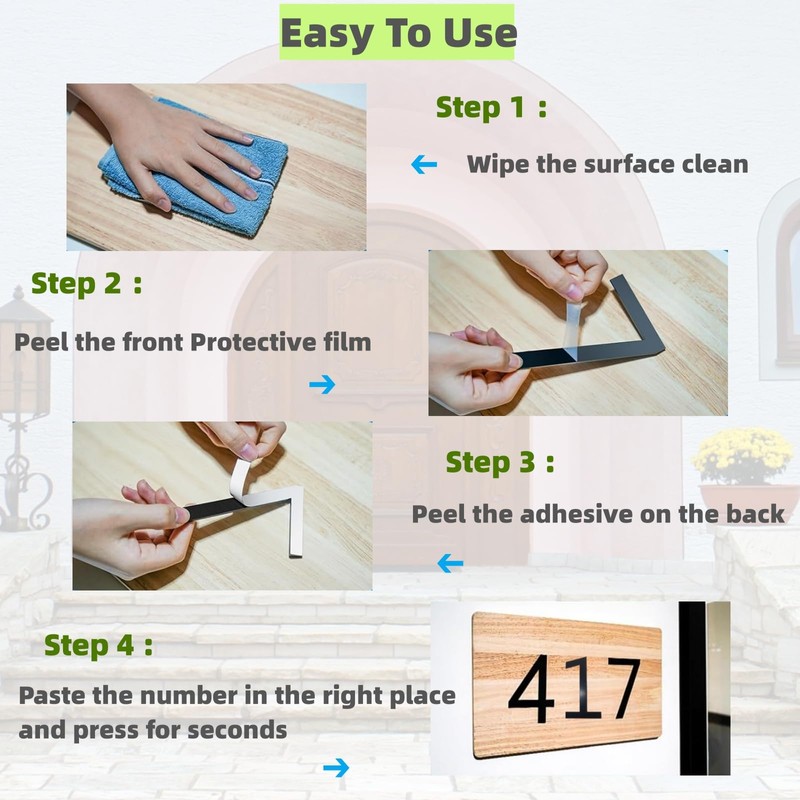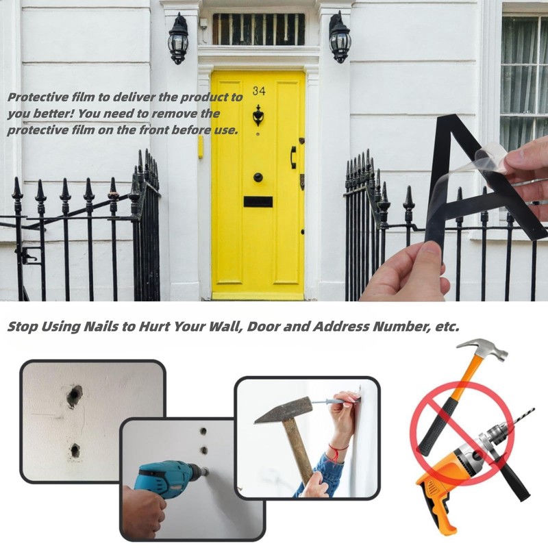- 【Easy to Install】All you need to do is follow the steps in the instructions, peel the tape on the back of the house number and stick it on any flat, clean and dry surface. You don't need to drill holes and it won't damage the mounting surface.