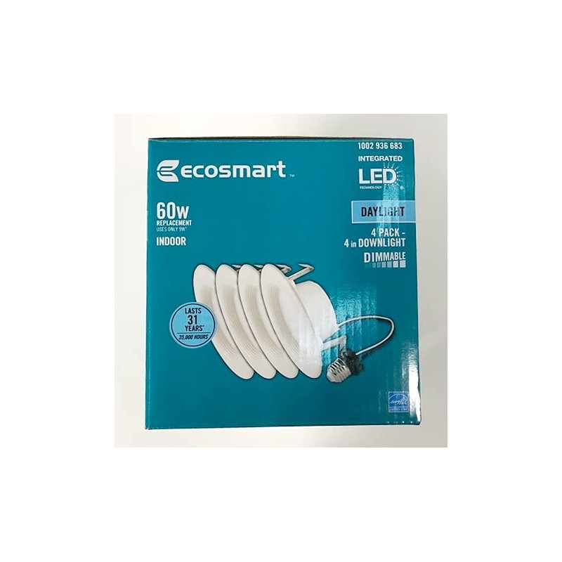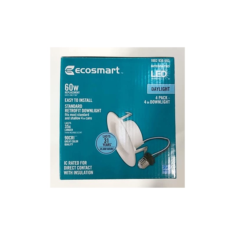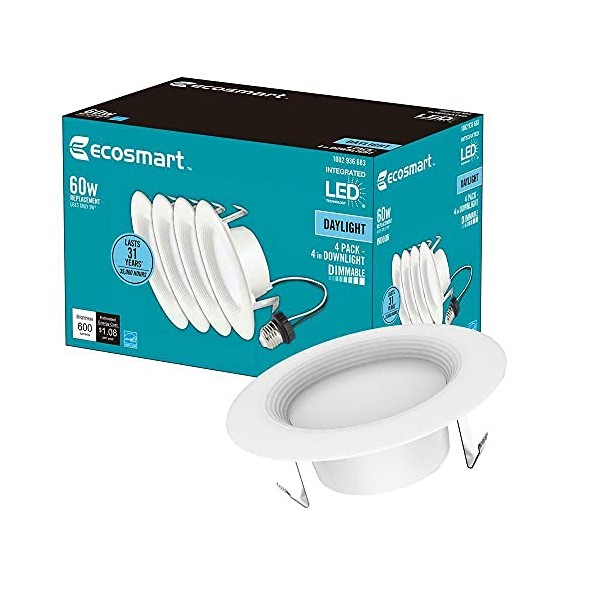 The 4 in. Daylight (5000K) Ecosmart LED downlight is an easy way to upgrade your existing can lights to the sleek look of recessed lighting and LED energy efficient technology. These lights are equipped with an medium (E26) screw in base, meaning they are easily retrofitted to your existing can lights. These LED downlights are fully dimmable and compatible with most LED dimmer switches. ENERGY STAR rated, these bulbs are estimated to cost only 1.08 to operate each year. Furthermore, these bulbs are expected to last for up to 35,000 hours of use. These LED downlights use only 9-Watt of energy, but produce brightness similar to a 60-Watt incandescent light bulb