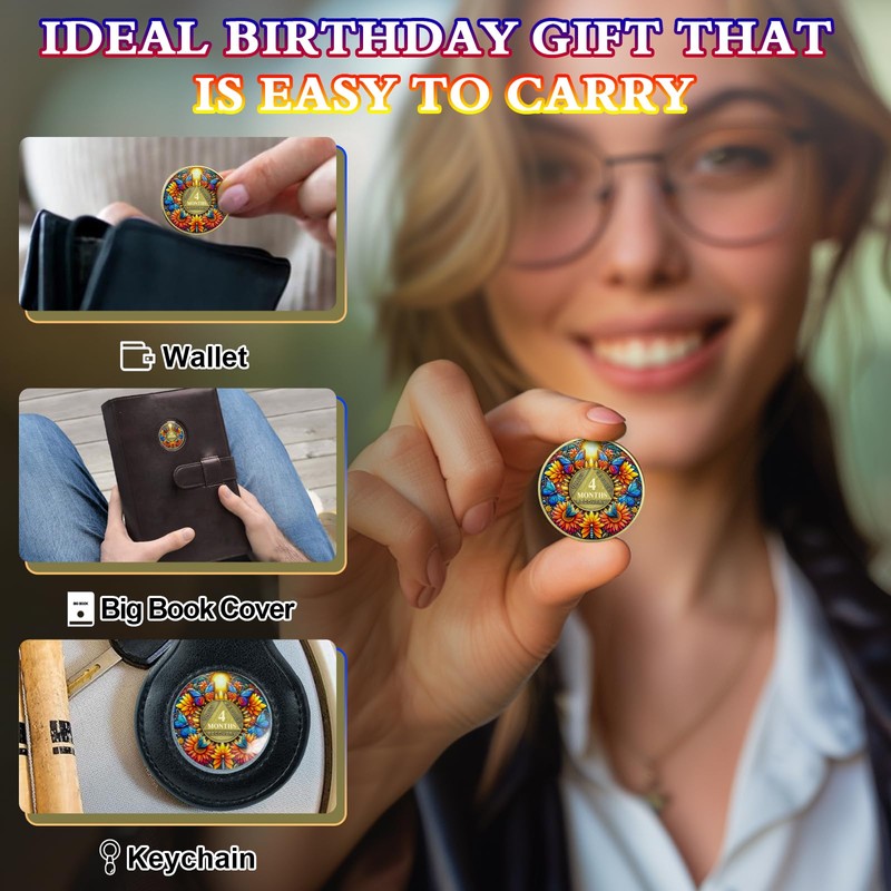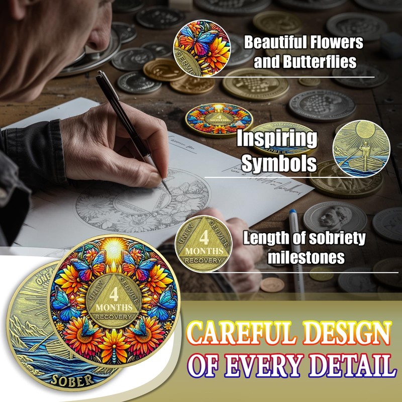 4 Months Sobriety Coin Four Months Flower Sobriety Coins Butterfly AA Chips and Medallion Sun Chips Recovery Anniversary Token Sobriety Gifts for Men Women Alcoholics Anonymous Gift