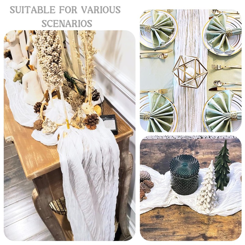 - Cheesecloth Table Runner:You will receive 4 white cheesecloth table runner. Each tablecloth is made of high-quality polyester.Soft and lightweight, no pilling or fading, can be reused for a long time.Sufficient quantity to meet your daily home decoration needs.