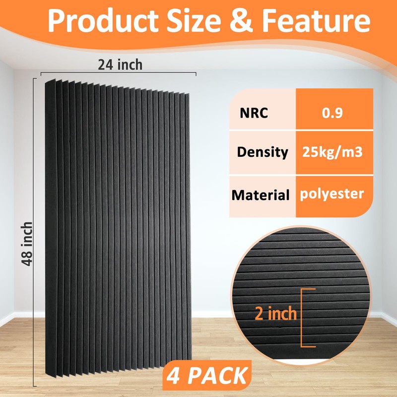 4 Pack Acoustic Foam Panels, 48 x 24 x 2" Sound Absorbing Panels High Density Studio Wedge Tiles for Home,Office, Recording Room, Studio (Black 4 Pack, 48 x 24 x 2 Inch)