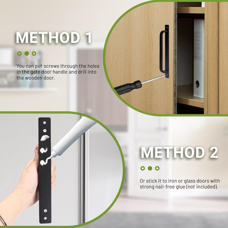 - 【2 Installation Methods】You can put screws through the holes in the gate door handle and drill into the wooden door. Or stick it to iron or glass doors with strong nail-free glue (not included)