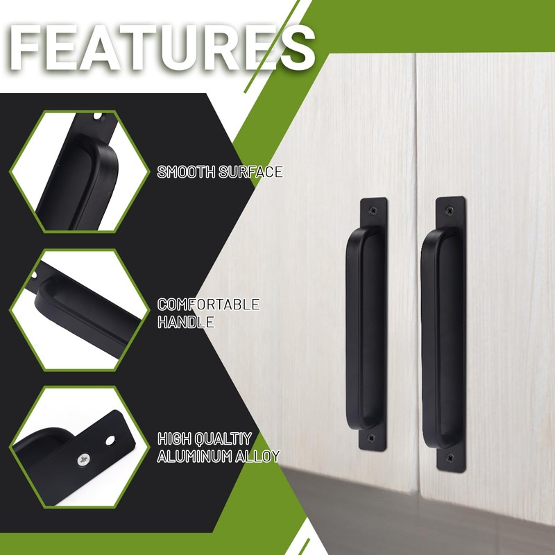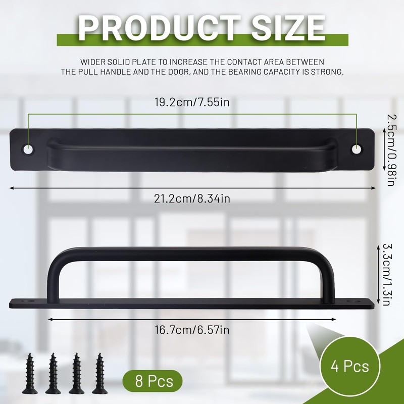 - 【Quantity & Size】You will get 4pcs black barn door handle, each with 2 screws. Overall length: 8.34"/212mm, width: 0.98"/25mm. Handle length: 6.57"/167mm, height: 1.3"/33mm. Hole to hole distance: 7.55"/192mm.