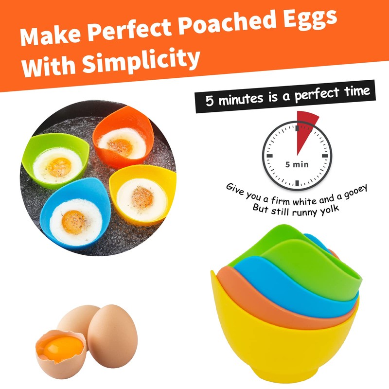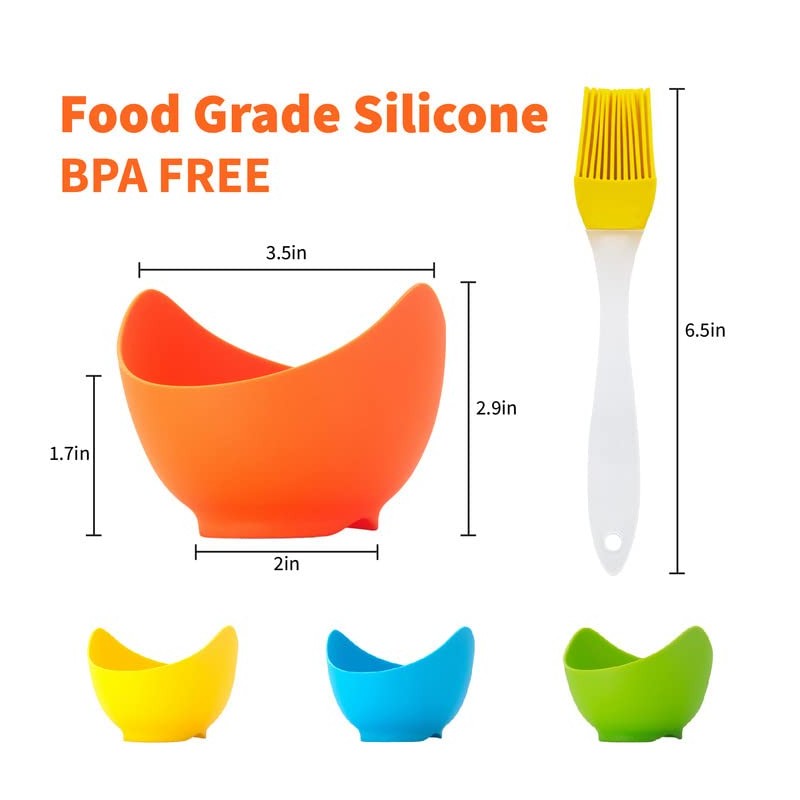 • The product includes 4 silicone egg poacher, and comes with a silicone oil brush, all made of food-grade silicone, BPA-free, including 4 colors, yellow, orange, blue and green.