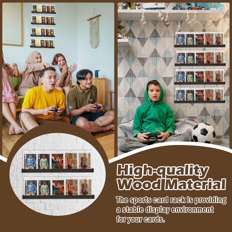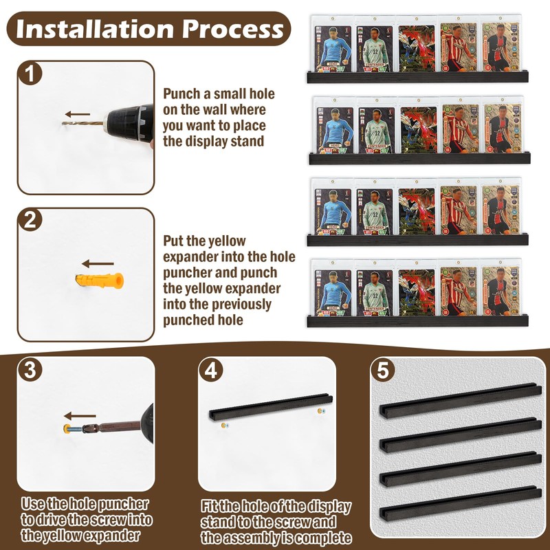 - 3、Easy to assemble: This black wall-mounted sports card display strip adopts an extremely convenient design, which is easy and quick to assemble. Each display strip is carefully prefabricated, without the need for complicated tools or tedious steps. Users only need to follow simple instructions to complete the installation in minutes. Its wall-mounted design saves space. Just fix it to the wall with the included accessories to easily create a personalized display space.