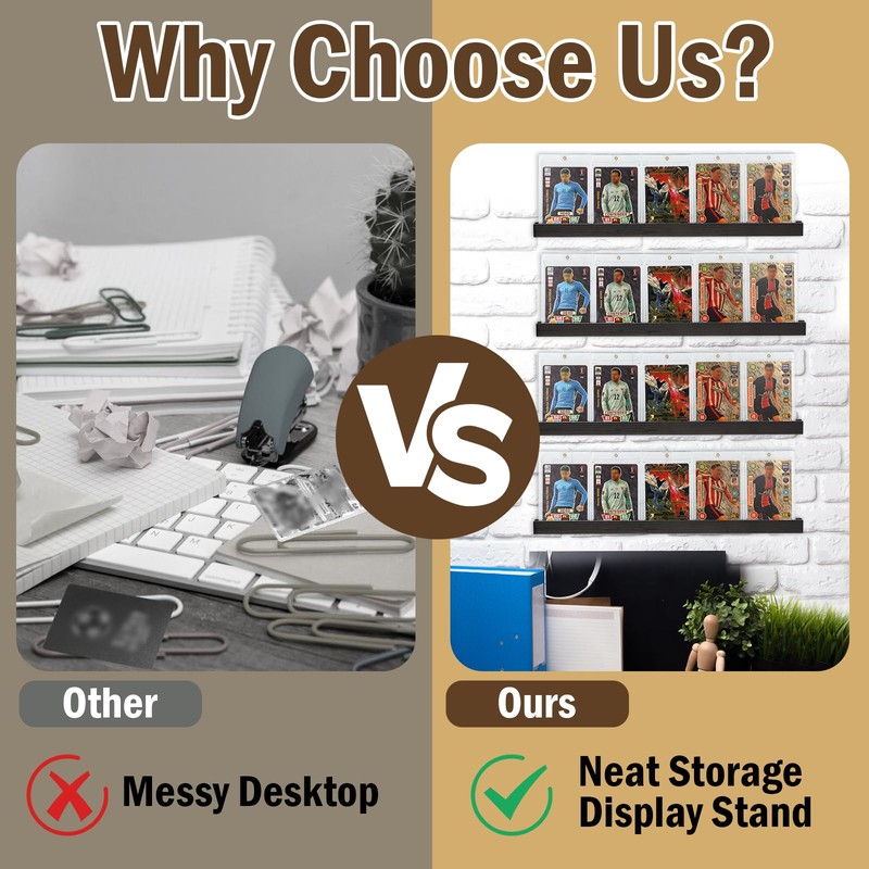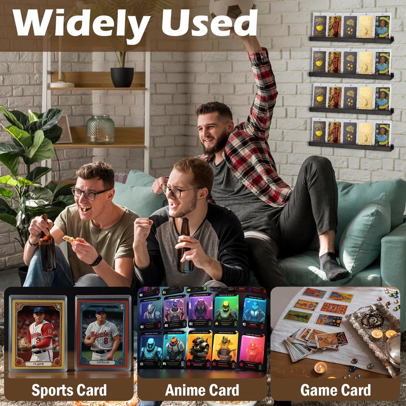 - 2、Compact size and practical design: The trading card rack contains 4 display racks, each display strip is 15*1.2*0.7 Inch in size, which is moderate in size and suitable for the display needs of various trading cards. Each strip can accommodate 5 cards with protective sleeves, or 4 graded card sleeves, making reasonable use of space, so that your precious cards can be neatly displayed and clear at a glance, whether it is a collection display or a trading display.