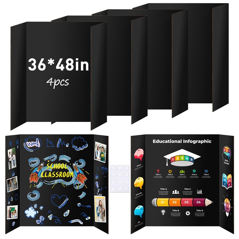 - Package included: Black Trifold Poster Board 4 Pack, 2 rolls of double sided adhesive tapes and adhesive dots, these all for Art, Display, Projects use.