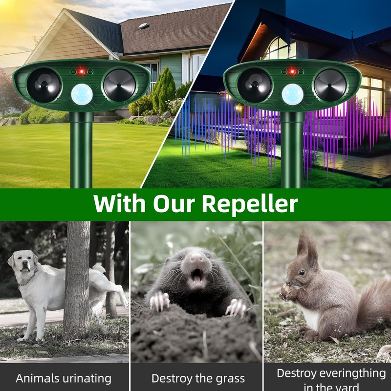 - Safe for Humans and Pets: Animal repellent uses humane way to stop animals from entering the living area, emitting ultrasonic waves to scare deer cat dog mouse bird skunk raccoon squirrel rabbit and other animals away from your zone, house, garden, or yard. Pure physical repellent method, harmless, will not cause harm to animals and humans