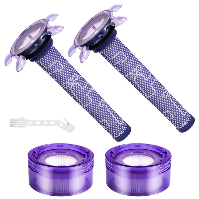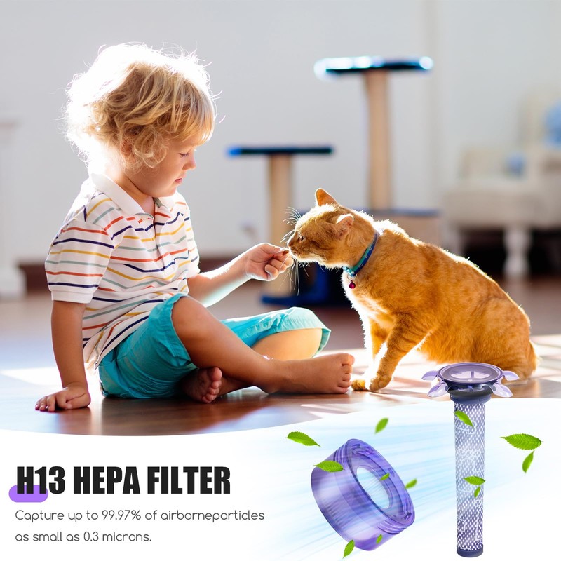 We Dyson v8 cordless filters replacement made of H13 HEPA grade filter Includes 2 Pack Post- Filters, 2 Pack star Pre- Filters and 1 White Multi-Purpose Brush for can efficiently filter dust with a purification rate of 99.9% and capture pollutant particles as small as 0.3 microns, creating fresh air for you and your family.