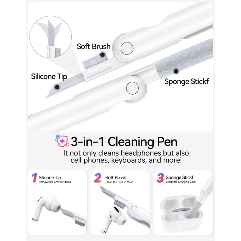 - 2-in-1 Cleaning Tool - Includes a dual-ended cleaning pen with a soft bristle brush on one end and a flexible loop tip on the other. Perfect for maintaining your earbuds, phone, keyboard, and other gadgets.
