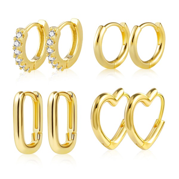 4 Pairs Small Chunky Hoop Earrings Set 14K Gold Plated Small Huggie Hoop Earrings Hypoallergenic Polished and Cubic Zirconia Oval Heart Hoops for Women