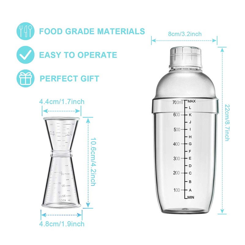 - High Quality Plastic: the cocktail shaker and double measuring jigger are made of plastic all are safe and durable materials, proper thickness makes them not easy to break, providing you with better beverage mixing experience